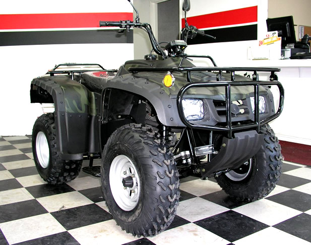 ATV250 Specification Engine Type 4-Stroke, Air-Cooled, 5-Speed Semi-Automatic Dimensions (mm): 1960 x 1010 x 1120 Wheel base (mm): 1160 Height of seat (mm): 780 Cylinder Arrangement Vertical Single Final Drive Shaft Bore x Stroke (mm) 71 x 58 Piston Displacement (cc) 230 Compression Ratio 8.7:1 Maximum Power (kw/r/min) 10 Maximum Torque (N.m./rpm) 15 / 6000 Starter System Electric/Recoil Backup Lubrication Pressure/Splash Transmission 5-Speeds Semi-Automatic with Reverse Dimension Overall LxWxH (in) 74 x 41 x 45 Wheel Base (in) 46 Seat Height (in) 32 Ground Clearance (in) 6 Rider Capacity 1 Person Dry Weight (lb) 485 Chassis Brake (Front/Rear) Drum/Drum Tire, Front 22 x 8-10 Tire, Rear 22 x 11-10 Ignition Type C.D.I. Fuel Tank Capacity (L) 12 Engine Oil Capacity (L) 1.6 Gear Oil Capacity (L) 0.27 Front Suspension Independent Front Suspension Rear Suspension Swing Arm Max. Load Capacity (lb) 363 |